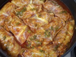 תוך כדי הבישול מורידים את עלי הכרוב לתוך המים.