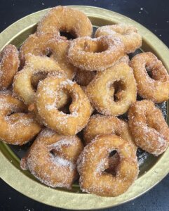 אחרי 10 דק מרימה חתיכה מהבצק עושה חור באמצע ומטגנת בשמן .