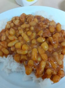 שעועית לבנה עם קוביות בשר על מצע אורז לבן