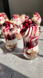 קינוח כוסות מהיר- שכבות עוגה פירורית, קצפת ופירות יער