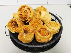 לתפוס את קצה הבצק עם מזלג או מקל לגלגל בתוך השמן החם לטגן להזהבה.