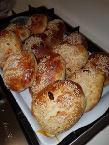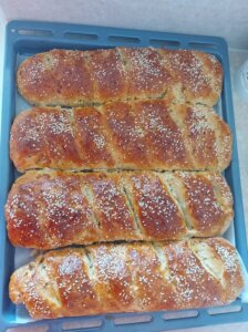 • מברישים את הכיכרות התפוחות בביצה טרופה ומפזרים בנדיבות שומשום וקצח.