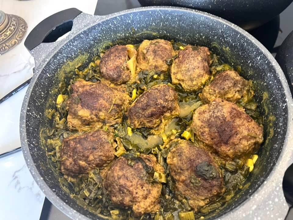 קציצות על שומר ברוטב עלי תרד וסלרי חמצמץ סיר מעלף המרכיבים- חצי קילו בשר טחון בצל חופן עלי סלרי פטרוזיליה מעט בהרט כורכום